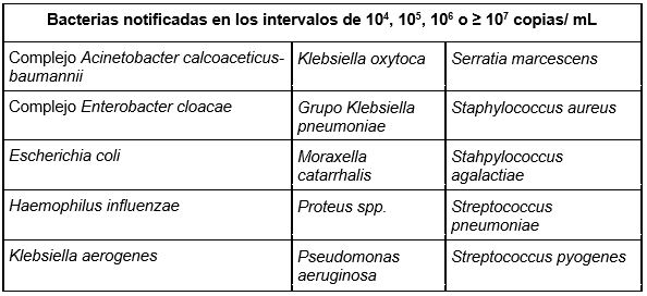 Se notifican las siguientes bacterias de manera semicuantitativa con intervalos que representan aproximadamente 104, 105, 106 o ≥ 107 copias genómicas de ácido nucleico bacteriano por mililitro (copias/ mL) de muestra, como ayuda en el cálculo de la abundancia relativa de estas bacterias comunes dentro de una muestra.
